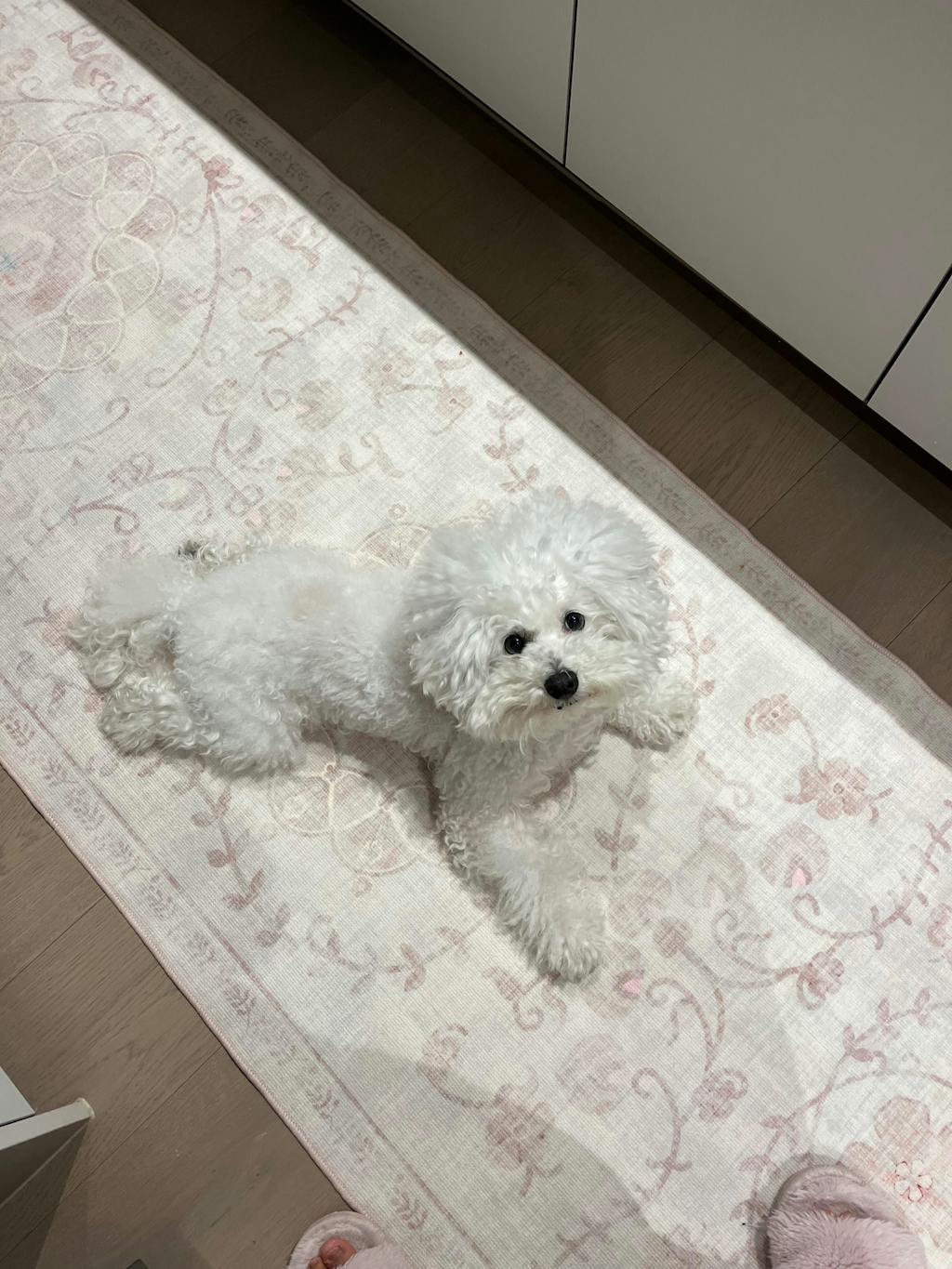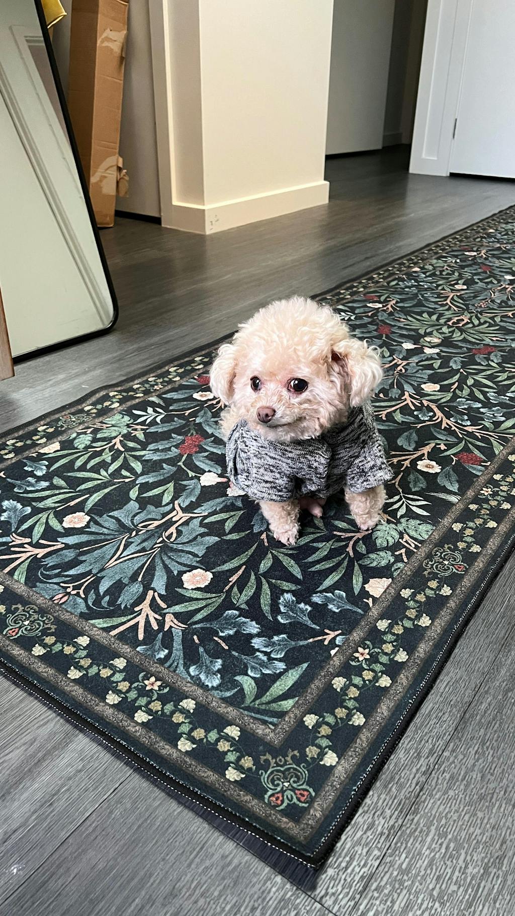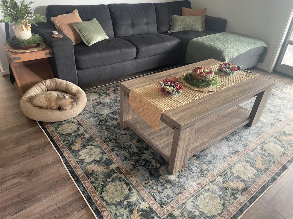 Benny loves wriggling around on this rug! Good thing the rug doesn't pick up dog fur that much, and is easy to spot clean. The rug edges are curled when it arrives, so I called the customer service. After rolling it the other way and ironing (their advice), the rug looks great. Overall, a good rug and decent customer service experience.
