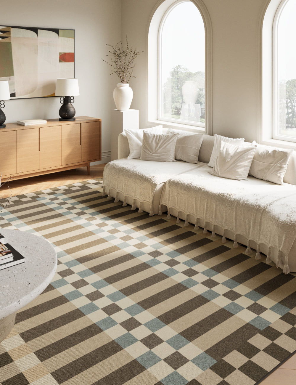 I bought the beige x2 and the taupe x1 for this rug for a bedroom and living room. And to say it is a statement piece in each of the rooms is an understatement.